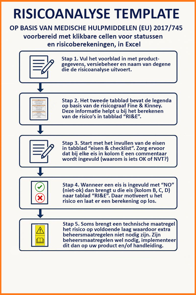 Deze risicoanalyse (in XLS) bevat de veiligheidseisen van de Medische Hulpmiddelen Verordening (EU) 2017/745. De Fine & Kinney methode is in de XLS geïntegreerd.